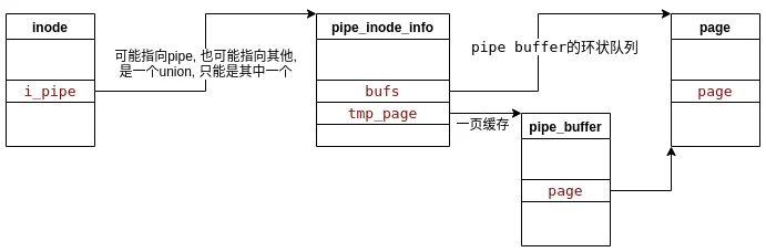 **/structpipe_inode_info{structmutexmutex;wait_queue_head_twait;unsignedintnrbufs,curbuf,buffers;unsignedintreaders;unsignedintwriters;unsignedintfiles;unsignedintwaiting_writers;unsignedintr_counter;unsignedintw_counter;structpage*tmp_page;structfasync_struct*fasync_readers;structfasync_struct*fasync_writers;structpipe_buffer*bufs;structuser_struct*user;};
