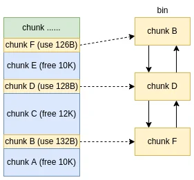 structmalloc_chunk{INTERNAL_SIZE_Tmchunk_prev_size;/* Size of previous chunk (if free). */INTERNAL_SIZE_Tmchunk_size;/* Size in bytes, including overhead. */structmalloc_chunk*fd;/* double links -- used only if free. */structmalloc_chunk*bk;/* Only used for large blocks: pointer to next larger size. */structmalloc_chunk*fd_nextsize;/* double links -- used only if free. */structmalloc_chunk*bk_nextsize;};