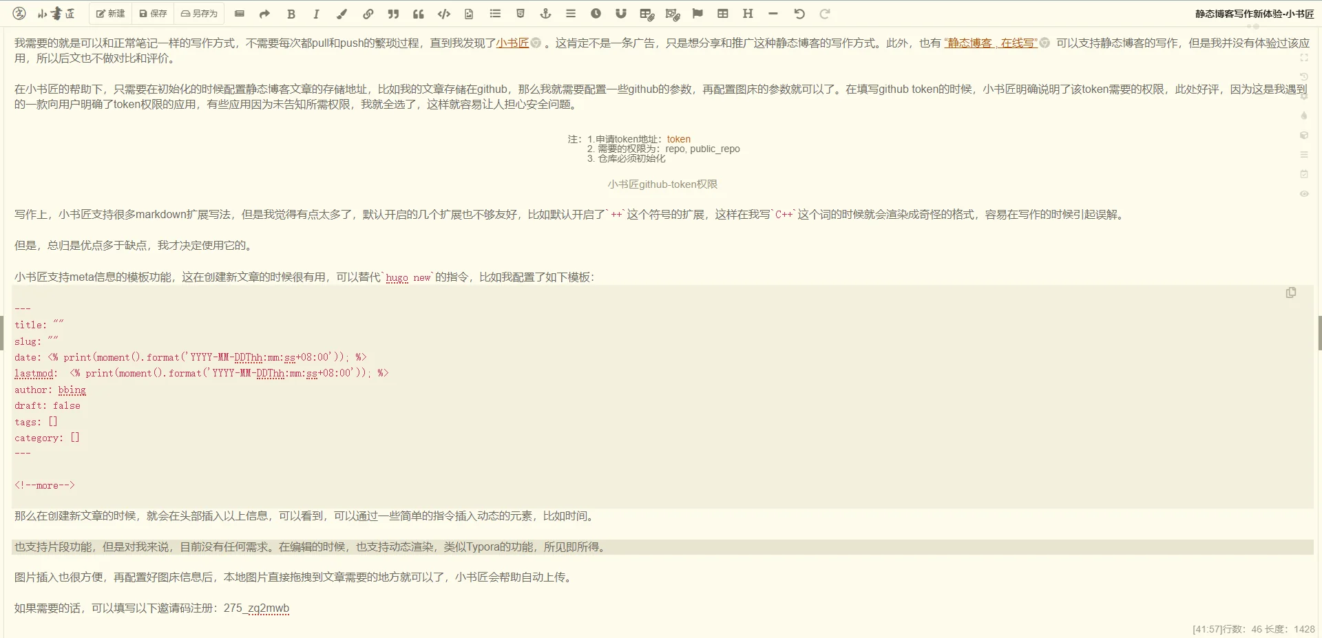 在小书匠的帮助下,只需要在初始化的时候配置静态博客文章的存储地址,比如我的文章存储在github,那么我就需要配置一些github的参数,再配置图床的参数就可以了。在填写github token的时候,小书匠明确说明了该token需要的权限,此处好评,因为这是我遇到的一款向用户明确了token权限的应用,有些应用因为未告知所需权限,我就全选了,这样就容易让人担心安全问题。
